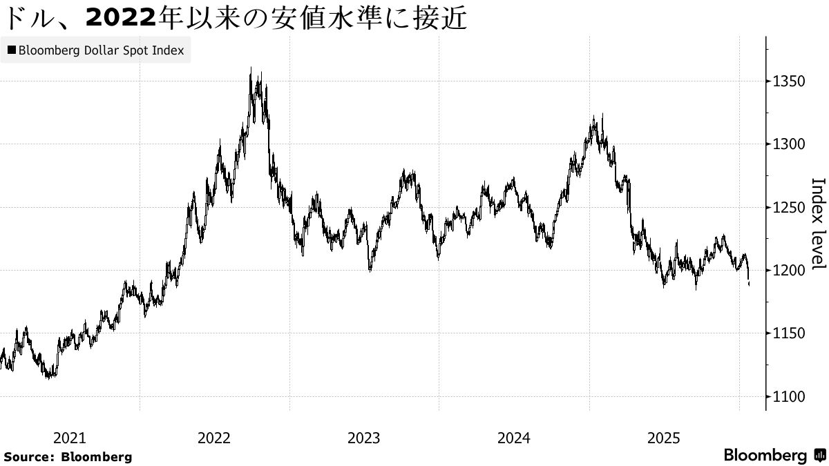 ブルームバーグ・ドル・スポット指数は、昨年初め以降で9%以上下落している。米連邦準備制度理事会(FRB)の独立性を巡るリスクや、パウエルFRB議長の後任がトランプ米大統領の意向に影響されて急速な利下げに動くとの見方も、拡大する財政赤字に加えて、ドルの重しとなってきた。