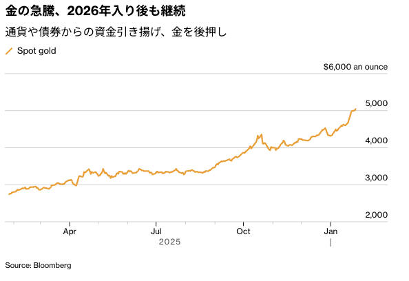 金スポット相場は7営業日続伸し、1オンス=5000ドル台を維持。トランプ大統領がドル下落を懸念していないと発言すると、上げ幅を拡大し、最高値を更新した。