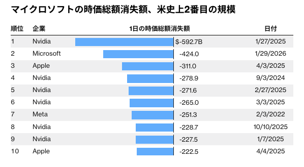 約12%下落率は、マイクロソフトにとって過去最悪のクラスに入る。1986年の新規株式公開(IPO)以降、これを上回る下落を記録した日は数えるほどしかなく、これには1987年のブラックマンデー、ITバブル期、2020年の新型コロナウイルス禍に伴う株式急落時が含まれる。