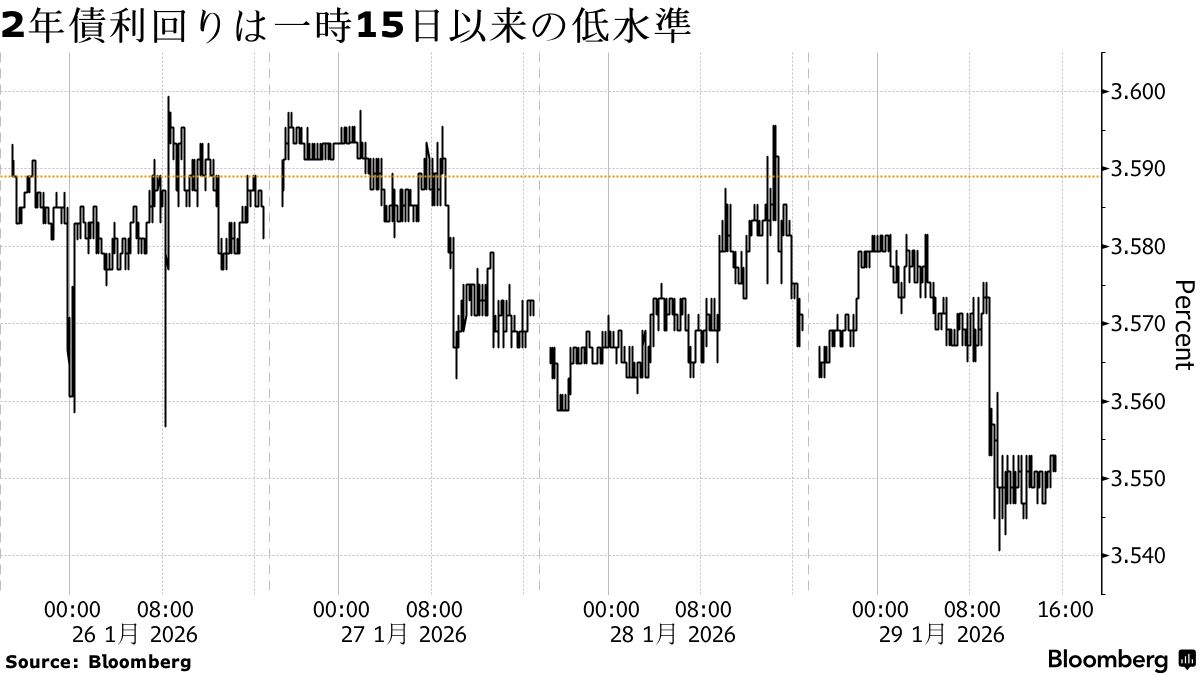 短期債中心に利回りが低下。2年債利回りは一時3.54%と、15日以来の低水準を付けた。