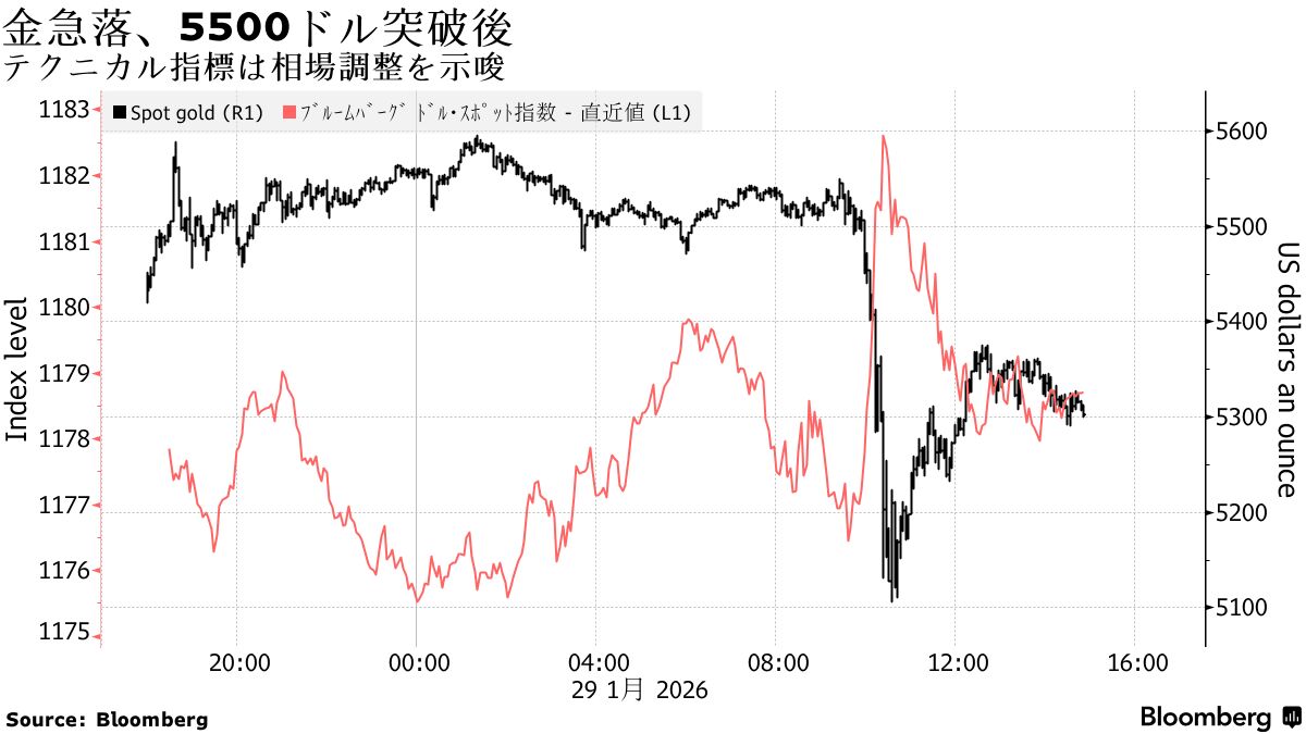 金スポット相場は急落し、昨年10月以来の大幅安となった。アジア時間には1オンス=5500ドルを突破し最高値を更新していたが、リスク回避の動きが強まる中、株式など他資産での損失を補おうと金属の売りが優勢になった。