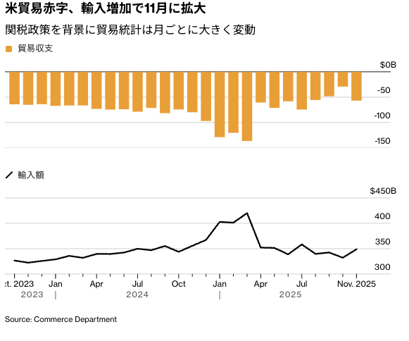 昨年11月の米貿易赤字は前月から拡大した。輸入が増加に転じる一方、輸出が減少したことが背景。前月の貿易赤字は2009年以来の低水準だった。トランプ政権の関税政策が揺れるなか、月ごとの振れが大きい状況が浮き彫りとなった。