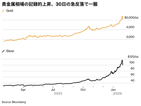 コメルツ銀行のアナリストは30日のリポートで、調整の大きさは「価格の急騰で、市場参加者が利益確定の機会を単に待っていただけだったことを物語る」と指摘。ウォーシュ氏指名を巡るうわさが売りを誘発したかもしれないが、FRBが「少なくともある程度は圧力に屈し、市場が現在織り込んでいるよりも多くの利下げを行う」可能性は高いとの見解を示した。