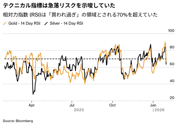 オーバーシー・チャイニーズ銀行(OCBC)のストラテジスト、クリストファー・ウォン氏は、金の動きは「価格の急騰があるなら、急落もあるという教訓を裏付けている」と述べた。ウォーシュ氏指名の報道が引き金にはなったものの、調整は遅過ぎたくらいだとし、「加速度的な動きの解消に、市場は口実を待っていたようなものだ」と述べた。