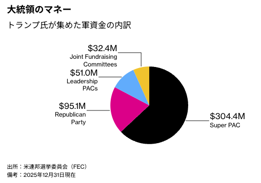 この金額は、民主党全国委員会(DNC)と同党の上下両院組織、スーパーPAC(政治活動委員会)を合わせた1億6700万ドルの3倍に近い。資金は富裕な支援者向けの高額イベントでの調達や、同氏のスローガンであるMAGA(アメリカを再び偉大に)を支持する層に少額の寄付を呼び掛けた結果だ。スーパーPACだけでも、2024年11月の大統領選勝利以降に3億1300万ドルを集めている。