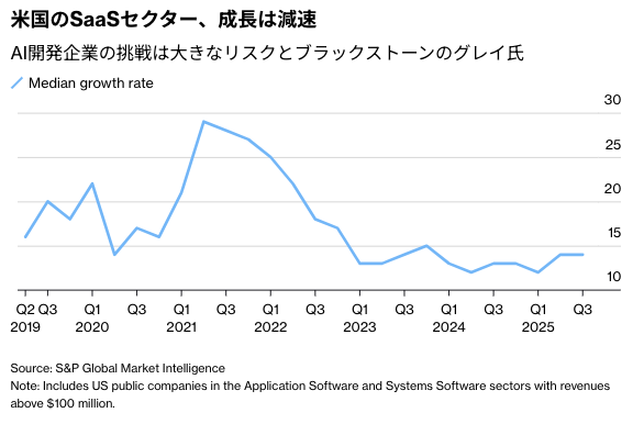 この発言はプライベートエクイティー(未公開株、PE)投資業界で深く定着している考えに真正面から疑問を投げ掛ける内容で、これまで報じられたことはなかった。投資家は長年にわたり、ソフトウエア関連は景気に左右されづらく安定した成長と収益が見込めるとして、多額の資金を投じてきた。だが、その前提が今や、人工知能(AI)革命で問われ始めた。
