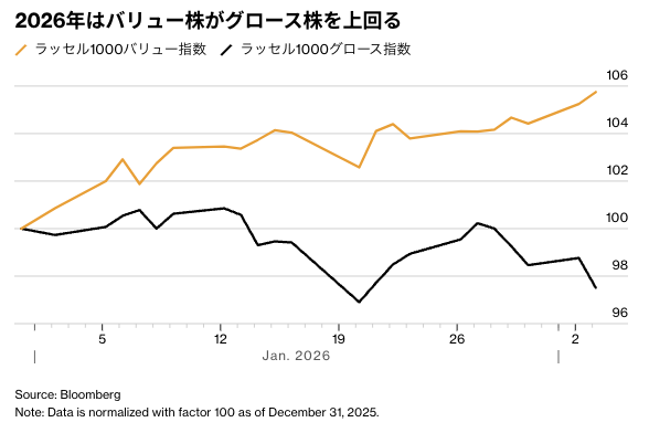 米国株式市場では過去3年間、「マグニフィセント・セブン」と呼ばれる巨大ハイテク7社が主導する格好で、AIトレードが支配的なテーマとなってきた。だが、足元ではこうした流れが後退し、物色先が市場全体に広がるとの見方が強まっている。実際に今年に入り激しいローテーションが起きており、バリュー株がグロース株を大きく上回るパフォーマンスを示している。