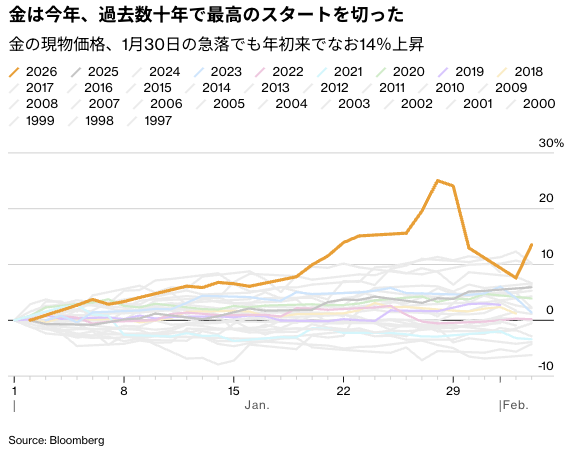 金と銀は1月、投機的な勢いや地政学的混乱、米連邦準備制度理事会(FRB)の独立性に対する脅威などを背景に急伸した。ただ、上昇があまりに急で大き過ぎるとの警告が相次ぐ中、前週末に流れは急変。銀は1日として過去最大の下げを記録し、金も2013年以来の大幅安となった。