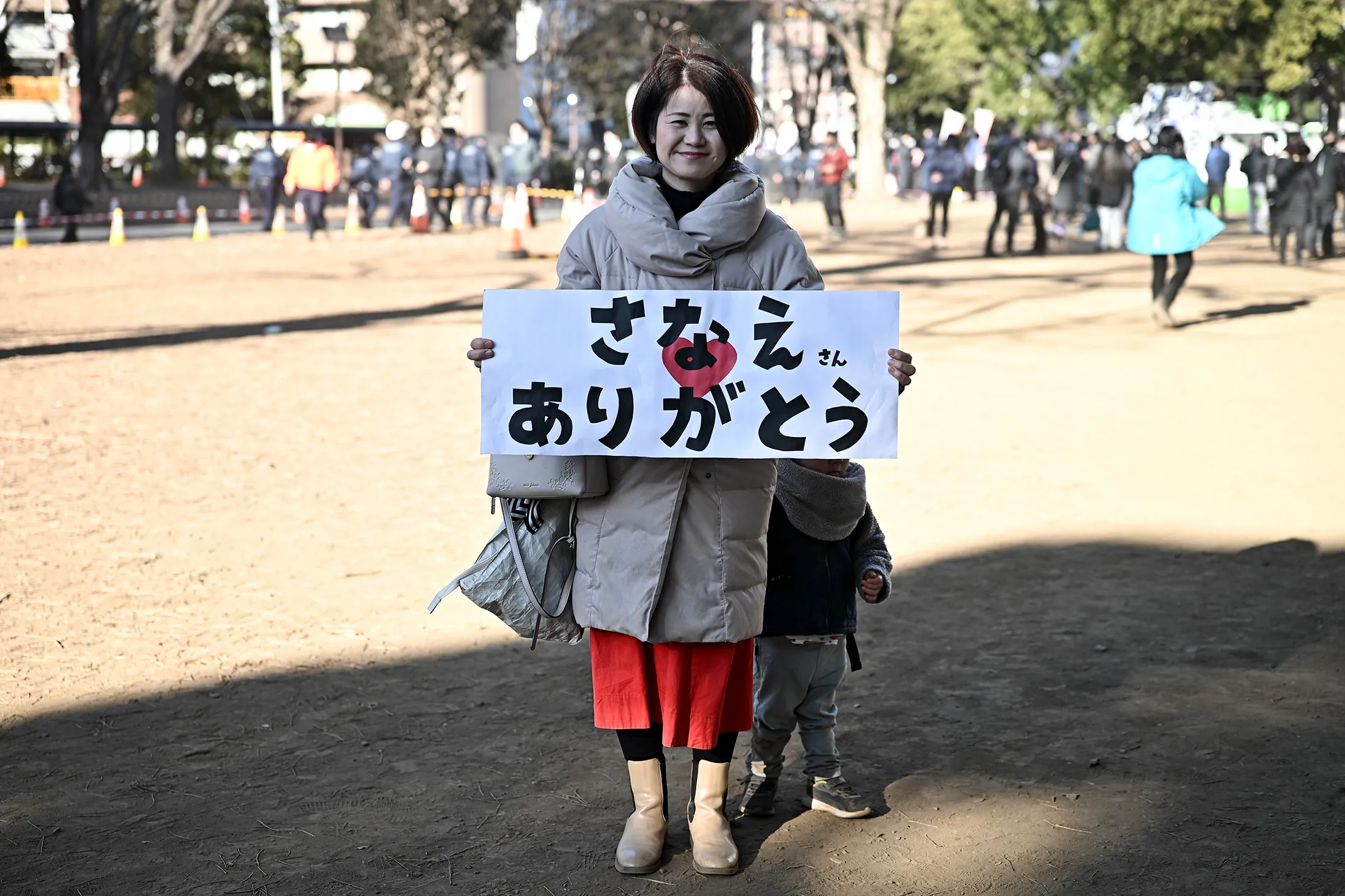 主婦の佐々木瞳さんは3日、「さなえさんありがとう」と書かれたボードを掲げながら、高市氏の演説に耳を傾けていた。
