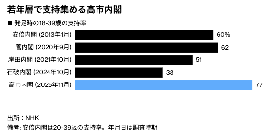 一部の世論調査では、高市内閣の支持率は18歳-20代で90%近くに達している。NHKの世論調査によると、内閣発足時の18ー39歳の支持率は77%で、石破茂内閣の38%、岸田文雄内閣の51%を大きく上回った。