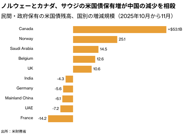 中国当局の指示はリスク分散との位置付けだが、インドやブラジルに見られる世界的な米資産離れの傾向を裏付ける可能性がある。トランプ米大統領がグリーンランド領有の意欲を公言するなど、地政学的リスクはこうした不安を高め、金などの代替資産への逃避を促している。