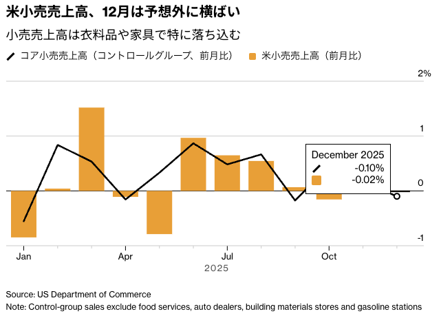 12月の小売売上高統計では、国内総生産(GDP)の算出に使用される自動車、ガソリン、外食、建設資材を除いたコア小売売上高(コントロールグループ)が前月比0.1%減と、予想外のマイナスとなった。