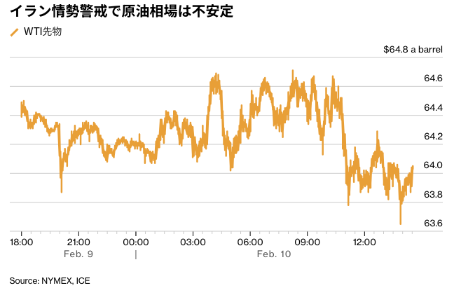 イランと米国の協議で仲介役を務めるオマーンのアルブサイディ外相は、先週行われた米国とイランの協議について「建設的だった」と述べた。この発言を受けて原油価格は下落した。ただ、その数分後には、イランとの交渉が決裂した場合、トランプ米大統領が中東に空母をもう1隻派遣する可能性があるとニュースサイトのアクシオスが報じ、原油先物は下げ幅を縮めた。