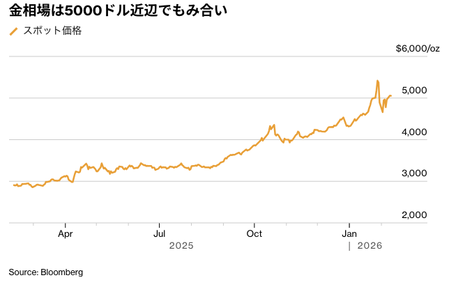 金スポット価格は方向感に欠き、1オンス=5000ドル付近でもみ合いとなった。歴史的な急落を経て、投資家は金相場が下値を固めたかどうかを見極めようとしている。