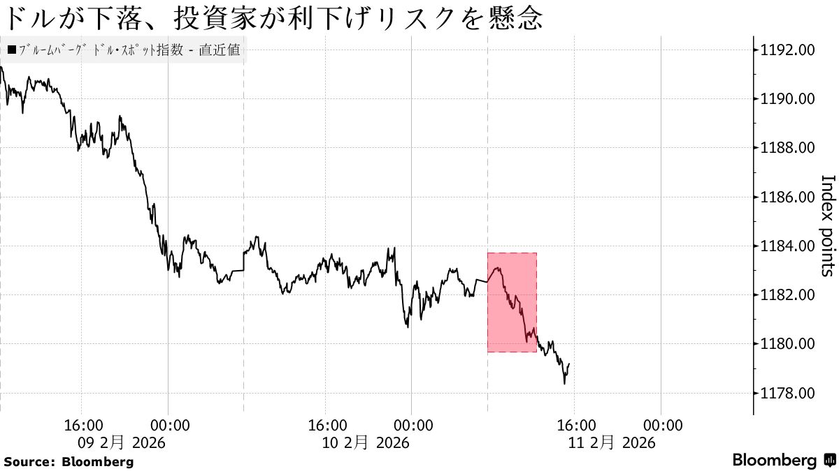 ブルームバーグ・ドルスポット指数は続落。10日に発表された米小売売上高が予想を下回り、FRBによる追加緩和を裏付けた。11日の雇用統計や13日のインフレ指標の発表を控え、ドルのポジションを縮小する動きが広がっている。