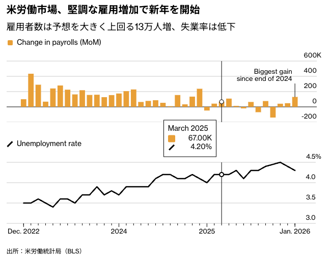 連邦公開市場委員会(FOMC)は昨年末にかけ3回にわたって利下げを実施。失業増加への警戒がその理由だったが、この日の統計でその懸念は緩和された可能性が高い。FOMCは1月会合で金利を据え置き、労働市場に安定化の兆しがあると説明していた。