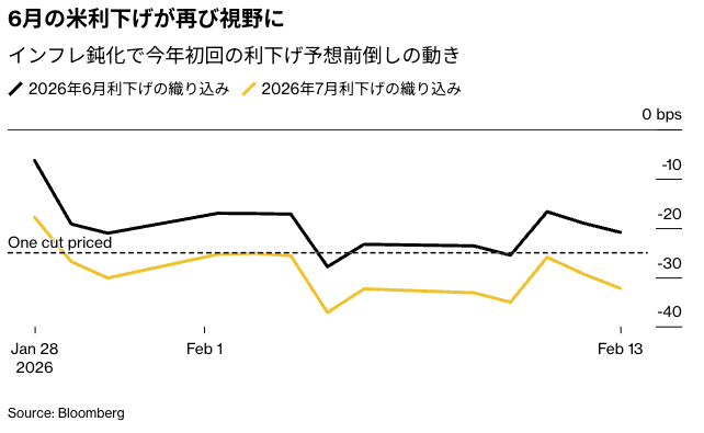 市場は引き続き7月の利下げを完全に織り込んでいるほか、6月についても高い確率を見込んでいる。FRBは2025年12月まで3会合連続で利下げを実施した後、1月の会合では政策金利を据え置いた。3月の利下げを予想していたウォール街の銀行は、11日に発表された1月の強い雇用統計を踏まえ、年内のより遅い時期に利下げ予想を後ずれさせた。
