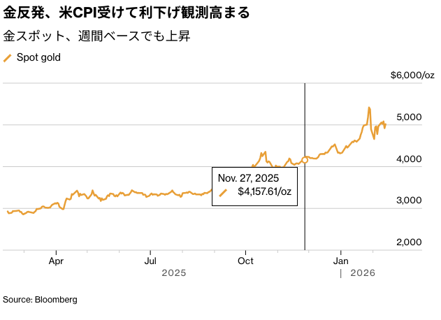 金スポット相場は反発。1月の米CPIを受けて、利下げ観測が高まったことが背景。金利低下は通常、利回りを生まない金への追い風になる。また前日の急落を好機とみて、押し目買いに動く投資家もいた。