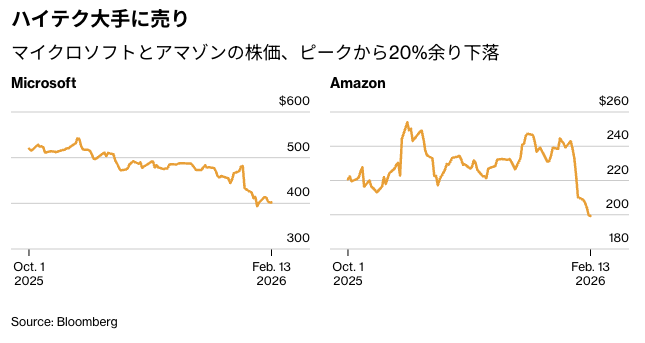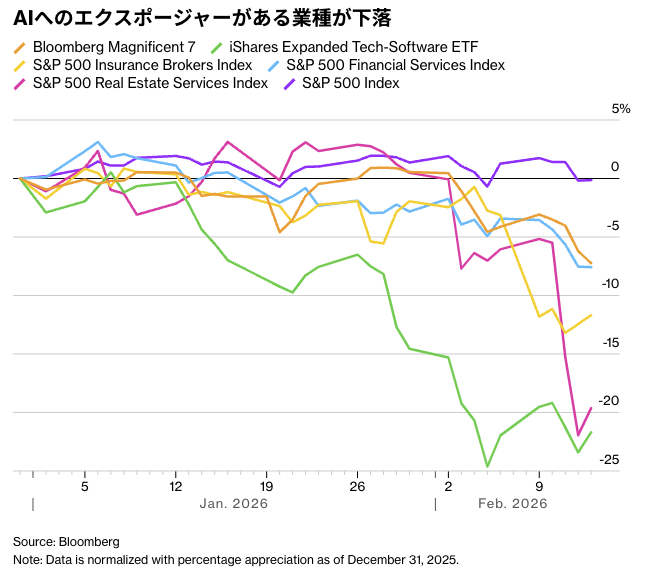 こうした相反する2つの不安はここ数カ月間くすぶってきたが、過去2週間で株式市場の中心テーマに浮上。この結果、不動産サービスや資産運用、保険ブローカー、物流など幅広い業界で、多数の企業が厳しい売りを浴びた。AI投資を積極的に進めてきた大手ハイテク企業は、時価総額を計1兆ドル(約153兆円)余り喪失した。