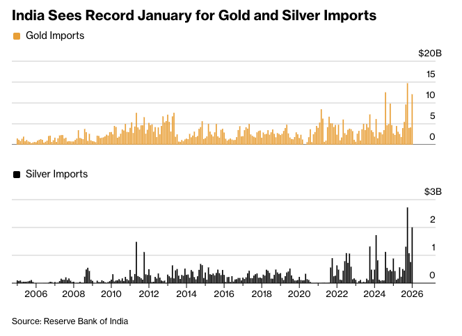 インドの輸入統計によると、1月の金および銀の輸入額は記録的水準に迫った。金輸入額は120億ドル超と、月間としては過去3番目の高水準を記録した。
