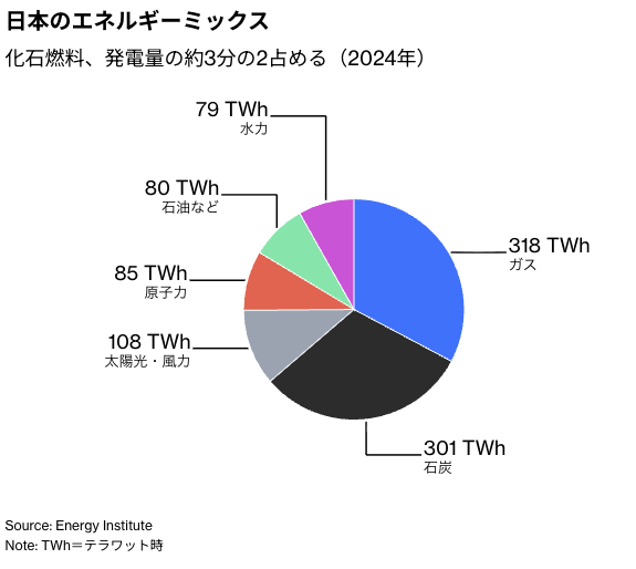 化石燃料は日本のエネルギー需要の約8割を占める。日本は脱炭素化の希望の多くを、化石燃料を燃やす発電所の閉鎖ではなく、石炭依存の炉にバイオマスやアンモニアを混焼することに託している。