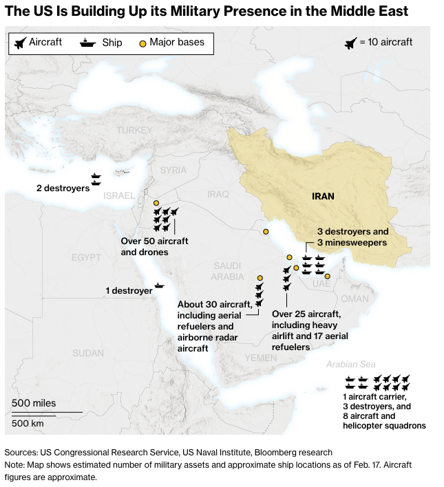- 米軍は中東に2隻の空母、戦闘機、給油タンカーなど配備