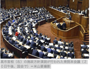 高市首相は20日、衆参両院の本会議で就任後初の施政方針演説を行った。食料品を対象にした2年間限定の消費税減税について、超党派の「国民会議」で検討を加速し、関連法案の「早期提出を目指す」と表明した。衆院選での自民党の歴史的大勝を踏まえ、憲法改正の国会発議が「早期に実現されることを期待する」とも語った。