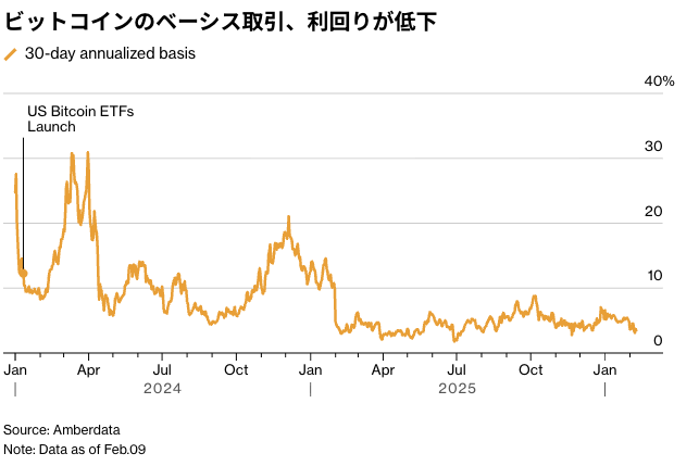アンバーデータによれば、ビットコインETFが初めて上場の承認を得て以降の数カ月間、この戦略のリターンは年率換算でしばしば2桁に達していた。だが、この裁定取引への参入が増えるにつれてリターンも低下し、今月9日時点では約4%となった。