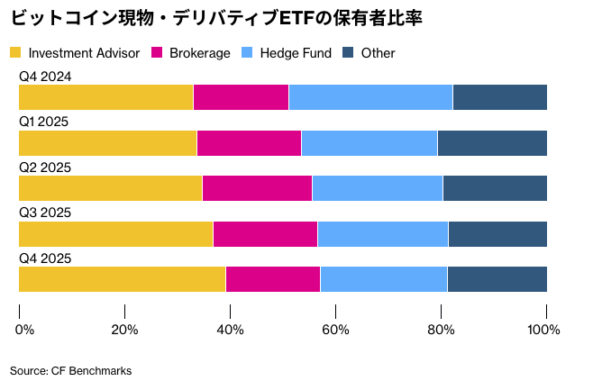 暗号資産交換業者クラーケンの完全子会社であるCFベンチマークスがまとめたデータによれば、ビットコインETF保有上位のヘッジファンドは昨年7-9月(第3四半期)から10-12月(第4四半期)にかけて、持ち高を28%減らした。