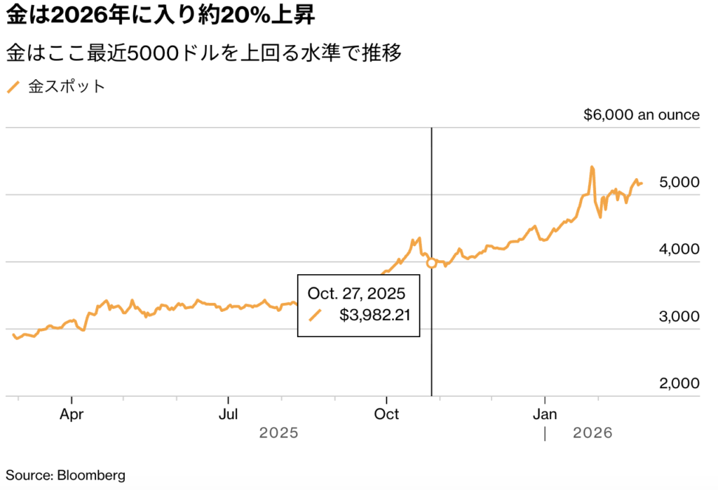 中東での米軍増強で世界市場の緊張が高まる中、金価格は過去6営業日で6%近く上昇。米国とイランは26日、3回目の核協議を実施した。トランプ大統領は、イランに3月1-6日頃までの合意を迫っており、合意に至らなかった場合は軍事攻撃を行うと脅している。