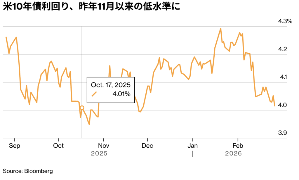 BMOキャピタル・マーケッツのイアン・リンゲン氏は「テクノロジー株のバリュエーションを巡る不確実性が米国債への堅調な需要につながり、10年債利回りを再び4.02%未満に押し下げた」と述べた。