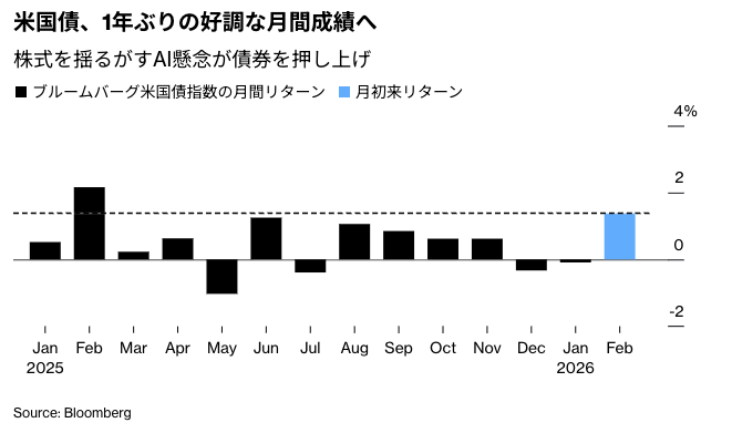 米国債相場は1カ月続いた上昇基調を一段と強めた。AIの破壊的かつディスインフレ的な影響を示す動きや、地政学的緊張の高まり、プライベートクレジット市場での不安などが背景にある。