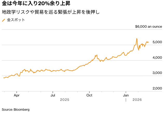金は今年に入り20%余り上昇している。1月下旬の最高値から急落した後、再び1オンス=5000ドルを上回る水準を回復した。月間では7カ月続伸となる見通しで、実現すれば1973年以来の長期上昇局面となる。
