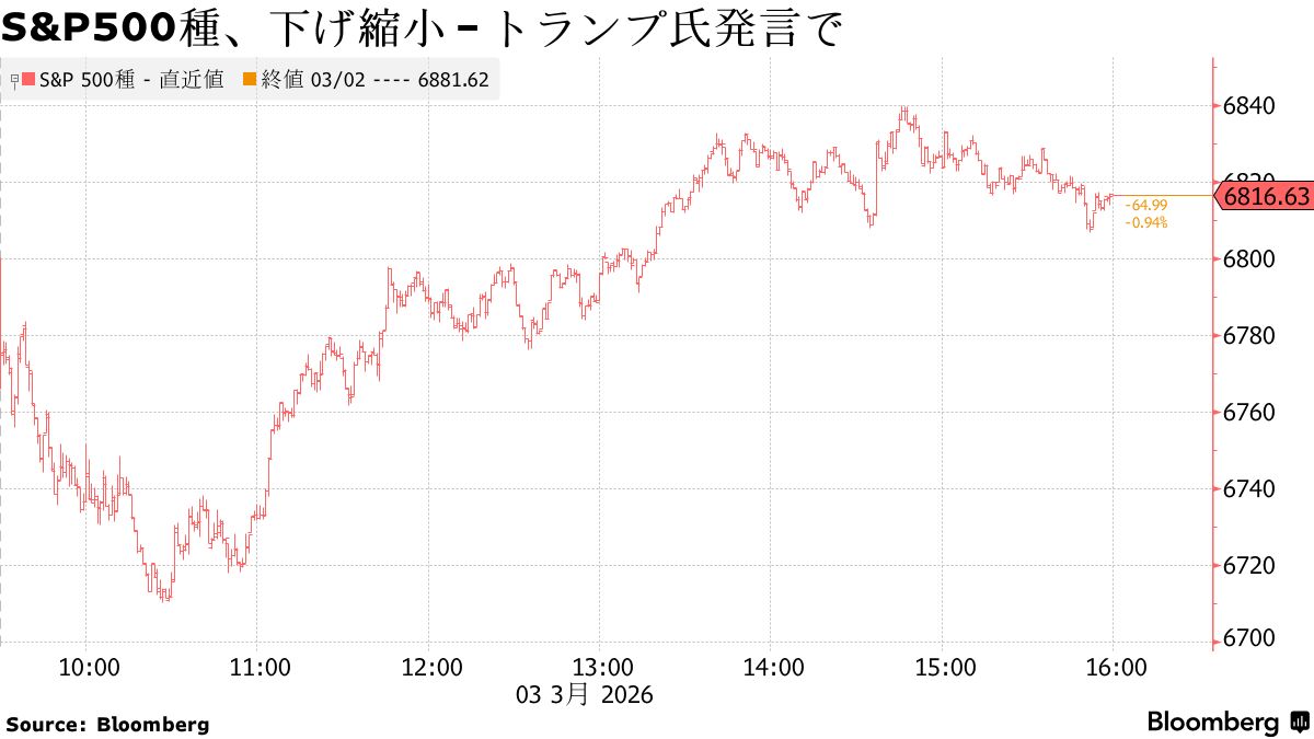 3日の米金融市場では株式と国債相場がいずれも下げ幅を縮小した。イランでの戦闘が引き続きあらゆる資産クラスで激しい値動きを誘発したが、トランプ米大統領が海上輸送路の確保に向けて行動を起こすと表明したことで、原油価格が上げ幅を縮めた。