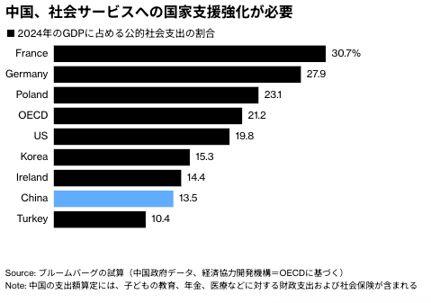 中国政府の公表データを基にブルームバーグが試算したところ、年金や医療、失業、低所得者向け住宅などを含む政府の社会支出は24年時点でGDPの13.5%相当だった。経済協力開発機構(OECD)加盟国平均の21.2%を大きく下回る。