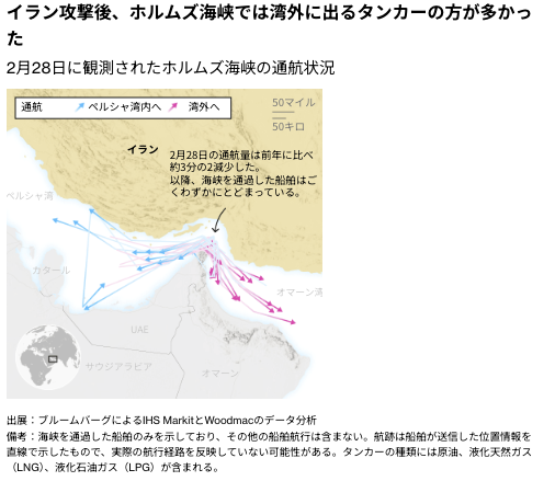 船舶が同海峡を通航できない、あるいは通航を避ける中で、生産国は輸出できず、超大型タンカーの輸送コストは急騰している。ペルシャ湾沿岸の多くの製油所では貯蔵能力が急速に逼迫(ひっぱく)している。船主などが共同で設立・運営する海上保険組合である船主責任相互保険(P&Iクラブ)主要12クラブのうち7クラブが、5日からペルシャ湾に入域する船舶に対する戦争リスクの補償を停止する見込みだ。