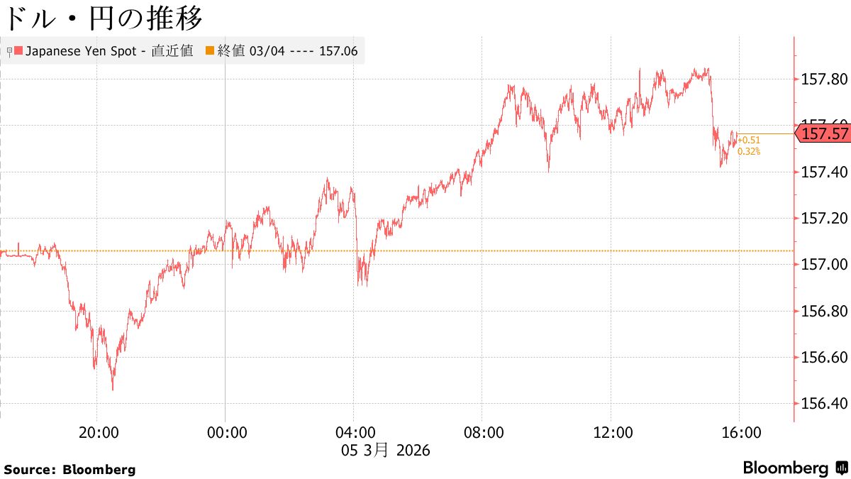 - 米2年債利回りは一時1月以来の高水準、ドル0.5%高の157円85銭