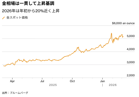 年初来の金相場は約17%上昇し、地政学と貿易面での緊張激化という追い風を受けている。また連邦準備制度理事会(FRB)の独立性が脅かされるとの懸念も、金買いを促している。価格は1月末に日中ベースでオンス当たり5595ドルを超え、過去最高値を記録した。