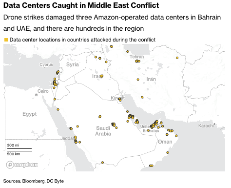 アラブ首長国連邦(UAE)とバーレーンでは、アマゾン・ドット・コムの施設3カ所がドローン攻撃により損傷した。非営利団体「ホリスティック・レジリエンス」の調査によると、イスラエルと米国は、テヘランで少なくとも2カ所のデータセンターを攻撃した。うち1つはイスラム革命防衛隊と関連していた。