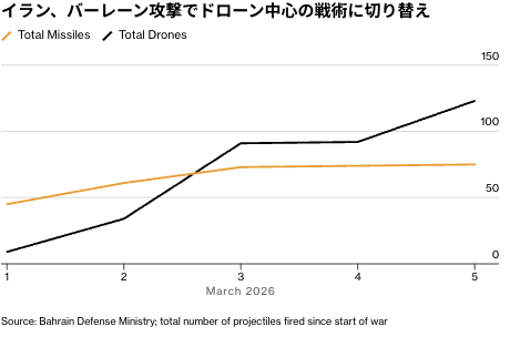 バーレーン政府のデータも、イランの戦術転換を示す。バーレーンの防空システムが迎撃したのはミサイルよりドローンの方が多く、ここ数日の波状攻撃に占めるドローンの割合はいっそう増した。