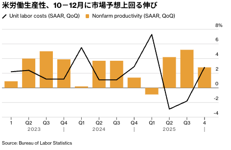 米国の労働生産性指数は2025年10-12月(第4四半期)に市場予想を上回る伸びとなった。7-9月(第3四半期)に記録した約5年ぶりの大幅上昇からは鈍化したものの、企業がコスト抑制のため効率向上に取り組んでいる状況が示された。