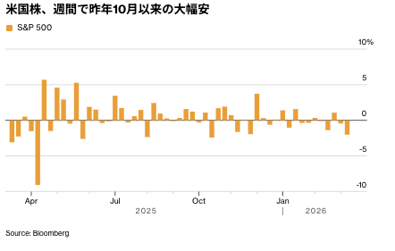 S&P500種株価指数は週間ベースでは昨年10月以来の大幅安。金融株の下げがきつい。ブラックロックは7.7%下落。同社は主力プライベートクレジット(ノンバンク融資)ファンドの一つで資金引き出しを制限した。