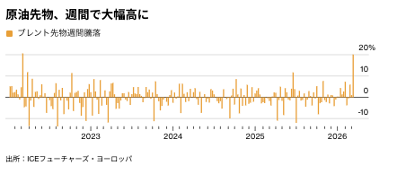 ニューヨーク原油先物は大幅続伸し、ウェスト・テキサス・インターミディエート(WTI)先物は週間ベースで過去最大の上昇率を記録した。ホルムズ海峡を通る海上輸送がほぼ完全に停止し、中東での戦争でエネルギー市場全体に混乱の波が広がっている。