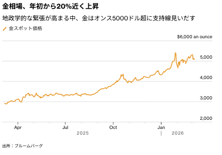 ここ数日の金市場は荒れ模様で、上昇の勢いは失速気味だが、年初からはなお20%近く上げている。トランプ政権の政策によって世界の貿易と地政学的状況が一変したほか、連邦準備制度理事会(FRB)の独立性が脅かされていることが、安全資産と見なされる金の追い風となっている。