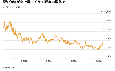 原油価格が1バレル=110ドルを突破した。中東情勢の緊迫化で主要産油国が相次いで生産を抑制し、重要な海上輸送路が事実上閉鎖となる中、米国は紛争の一段の拡大を示唆している。