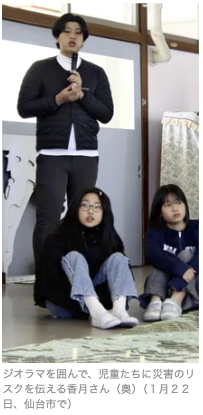 宮城県石巻市のITコンサルタント香月 昴飛 さん(32)は1月、仙台市立燕沢小の5年生を対象にした防災教室で震災体験を語った。「防災ジオラマ推進ネットワーク」(横浜市)の語り部として、段ボールの模型で津波や洪水、土砂崩れの危険箇所を学んでもらう活動に飛び回る。あの時、父を救えなかった自責の念があるからだ。