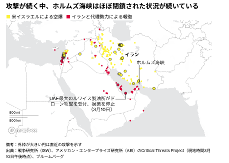 イランはイスラエルのみならず、サウジアラビアやアラブ首長国連邦(UAE)、カタール、バーレーンといったペルシャ湾岸諸国に向けてミサイルやドローンの発射を続けている。戦闘開始以降、ホルムズ海峡周辺でも攻撃が相次ぎ、世界の原油・天然ガスの約5分の1が通過するホルムズ海峡は事実上の閉鎖が続き、エネルギー市場が混乱している。