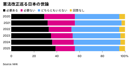 与党・自民党にとって長年の目標である憲法改正についても実行可能な道筋がある。軍を保持し、国益を守るために武力を行使する権利を明記する改憲への一般の支持は高まっており、中国の台頭や北朝鮮の脅威、予測不能な同盟国の米国を巡る懸念の広がりを反映している。