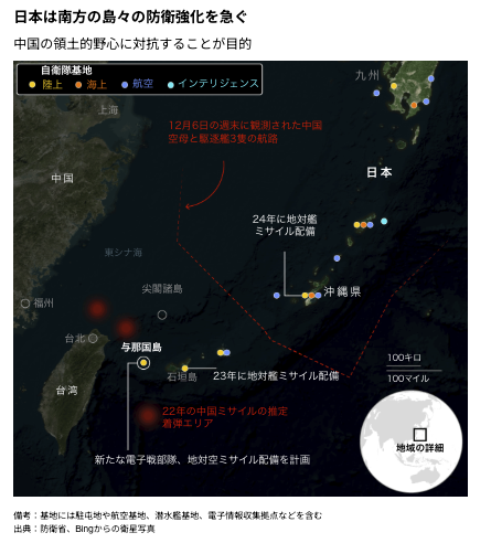 ロシアによるウクライナ侵攻や、台湾上空を通過した中国のミサイルが日本の排他的経済水域(EEZ)内に落下したことを受け、日本の防衛政策は22年に大きく転換。日本が攻撃を受けた場合の反撃能力の整備が進められた。島しょ部でミサイルやレーダー施設、弾薬庫の配備を急ぎ、防衛費を28年3月までに対国内総生産(GDP)比2%へ引き上げる方針が示された。