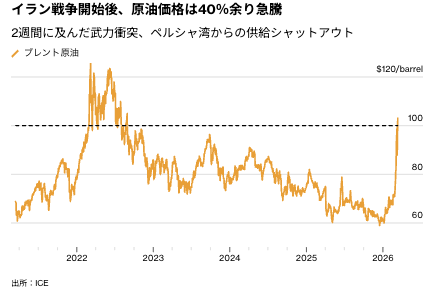 北海ブレント原油は2営業日連続で1バレル=100ドルを上回り、3年超ぶりの高値で引けた。一方、米ウェスト・テキサス・インターミディエート(WTI)原油先物も2022年7月以来の高値圏で終了した。ホルムズ海峡は事実上封鎖され、数百万バレルの原油がペルシャ湾に滞留している。